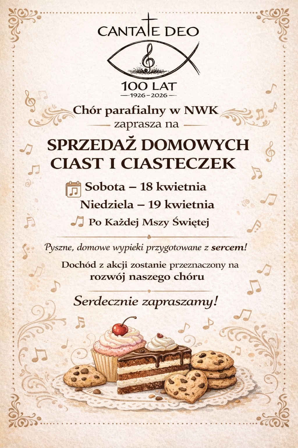 | Niedziela - 19 kwietnia będzie dodatkowa Msza św. o godz. 12.00 przedstawiciele naszego chóru będą sprzedawać przed kościołem ciasta i ciasteczka |